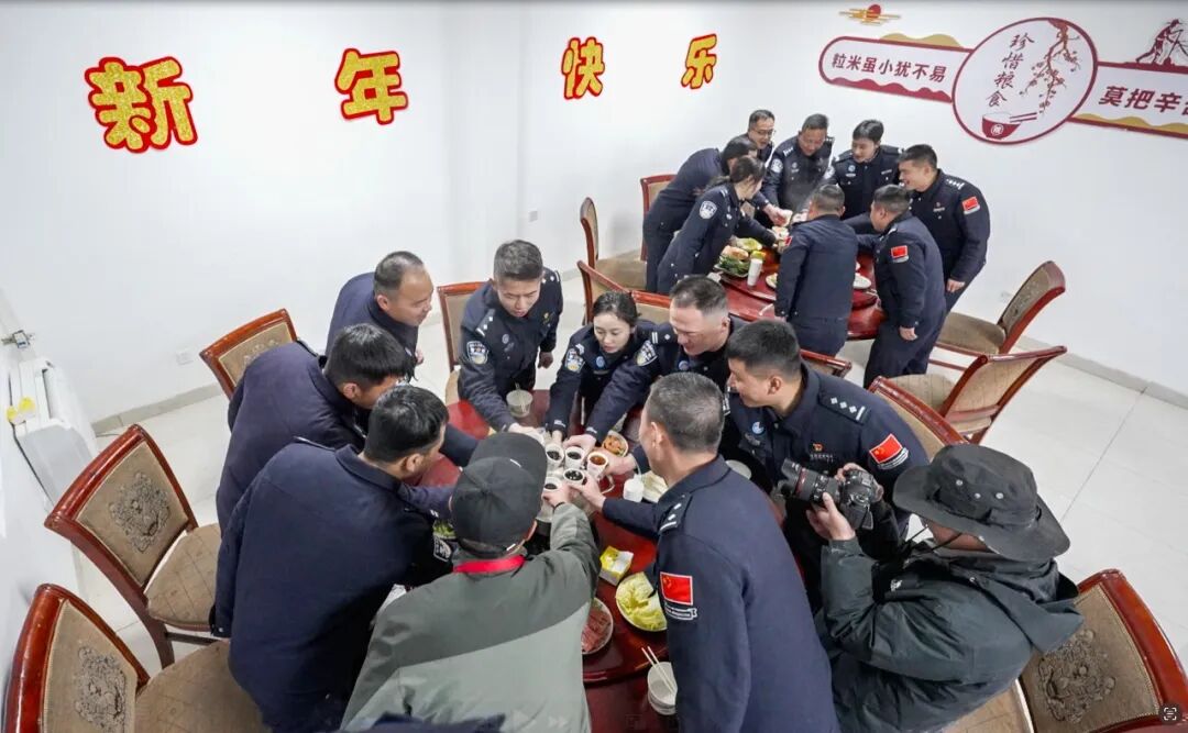 厨房里,简单的年夜饭正在准备;值班室内,电台指示灯静静闪烁。红灯映照着庄严的藏蓝警服,浓厚的年味交融着无声的坚守。