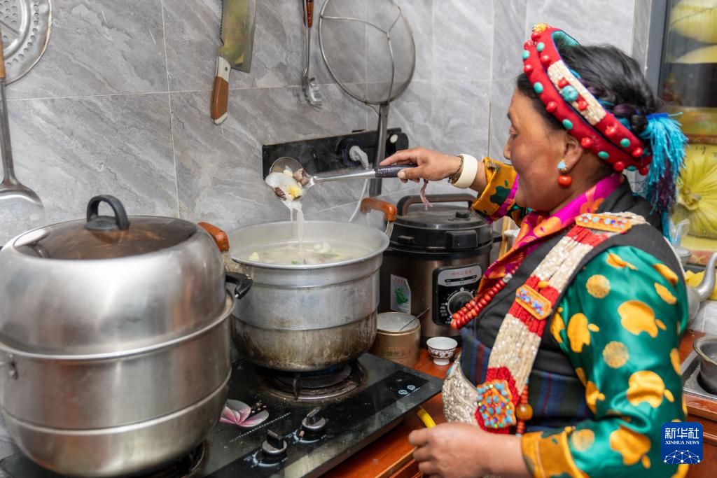 2月16日,长所乡古荣村村民卓玛次仁在新居厨房制作年节食品“古突”。在藏语中,“古”意为“九”,“突”意为“面”,“古突”是一种用牦牛肉汤加入牛肉、萝卜、奶渣等食材熬煮的面食。按西藏传统习俗,“古突”夜,家家户户迎来团聚,一起享用“古突”。新华社记者 旦增尼玛曲珠 摄
