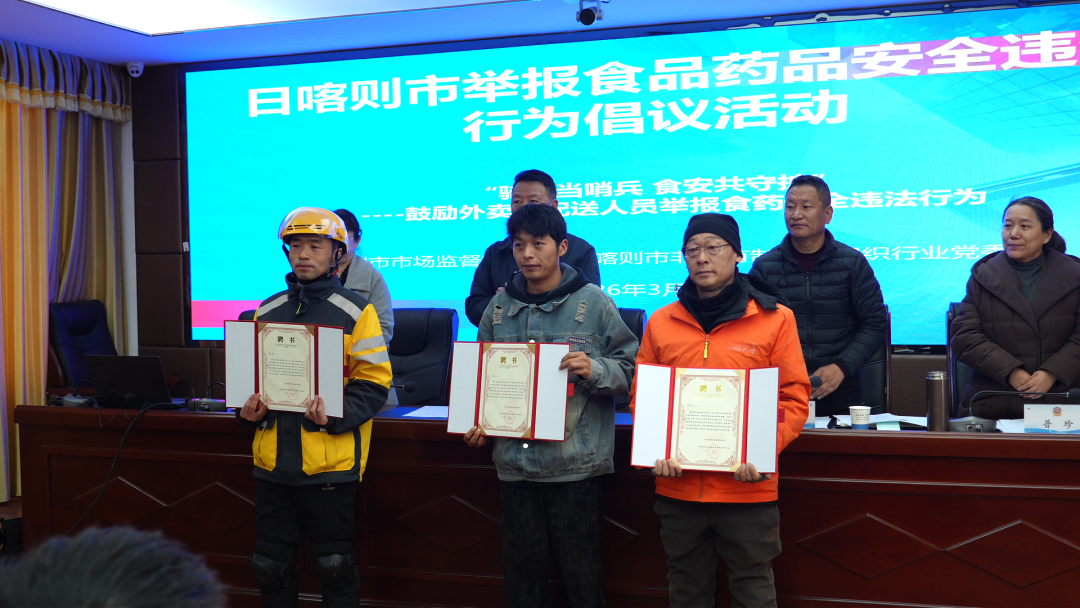 3月23日,日喀则市市场监督管理局举办食品药品安全违法行为举报倡议活动,正式设立全市首家非公经济组织“食品药品安全义务监督站”,并为43名外卖小哥授予“食药安全义务监督员”身份,进一步筑牢市民“舌尖上的安全”防护线。