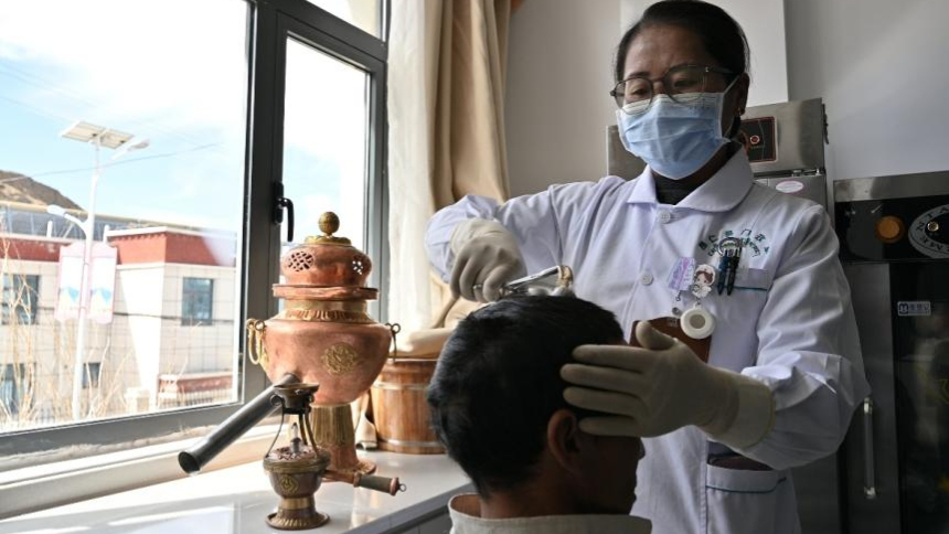 昂仁县藏医院医务人员准备给患者做霍尔麦疗法。新华网发 刘蒙青 摄