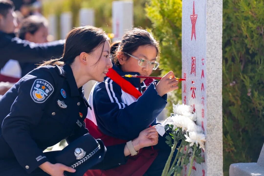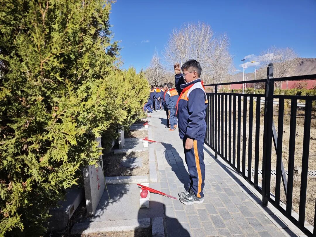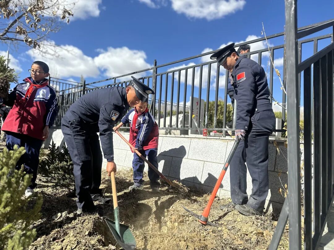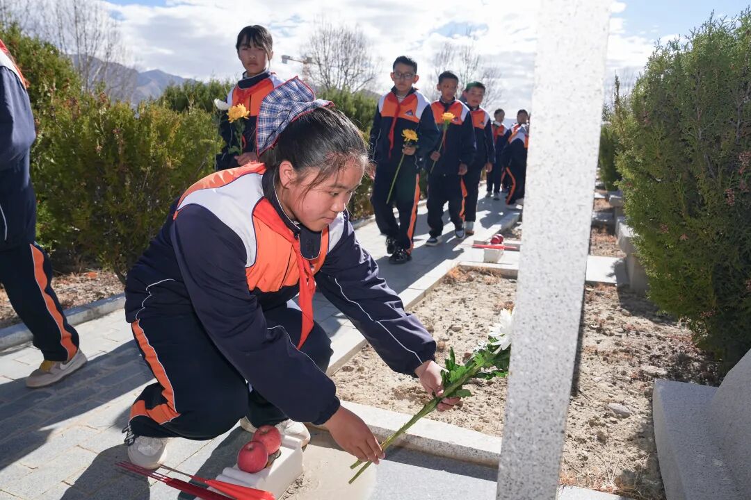 仪式落幕,温情延续。团市委、市少工委联合日喀则边境管理支队开展“缅怀英烈承壮志 守护边境育新人”红领巾寻访寻迹主题队日活动,全体人员出队旗、唱队歌,敬献鲜花、默哀致敬,少先队员重温入队誓词、集体呼号。随后,队员们在民警带领下为墓碑描红,全体人员共同栽种纪念树;少先队员聆听老兵的革命故事,为老兵佩戴红领巾、敬献礼品,分享寻访感悟,最后共同观看纪念影片,传承英烈精神、赓续红色血脉。