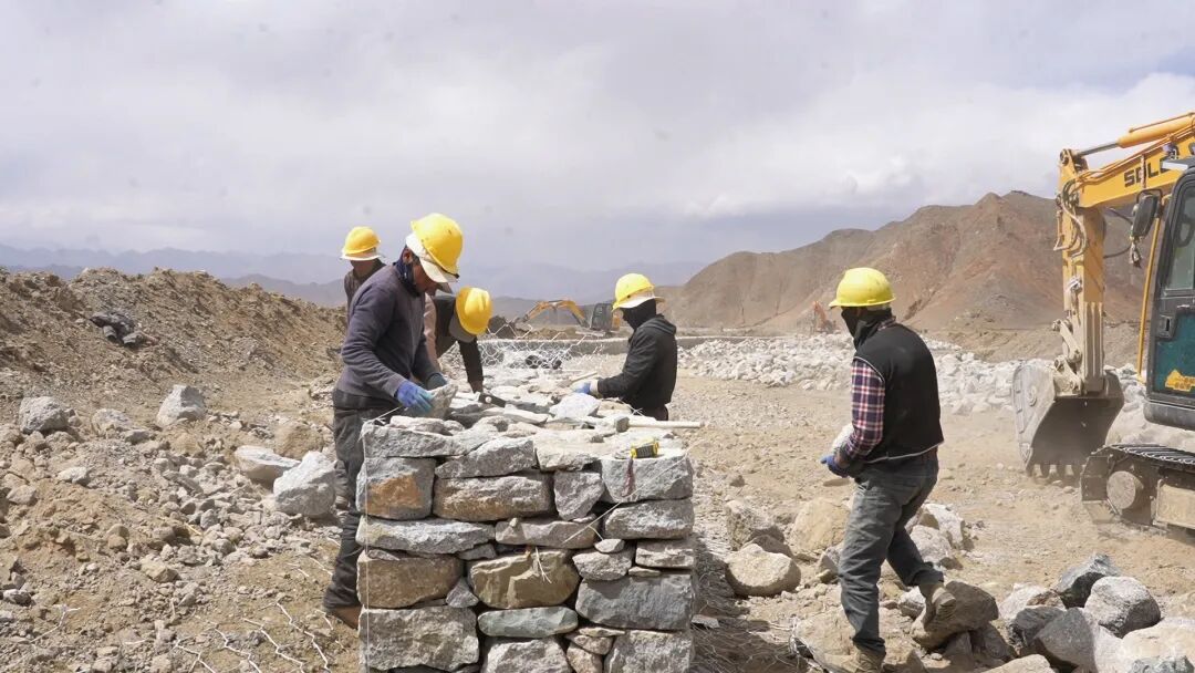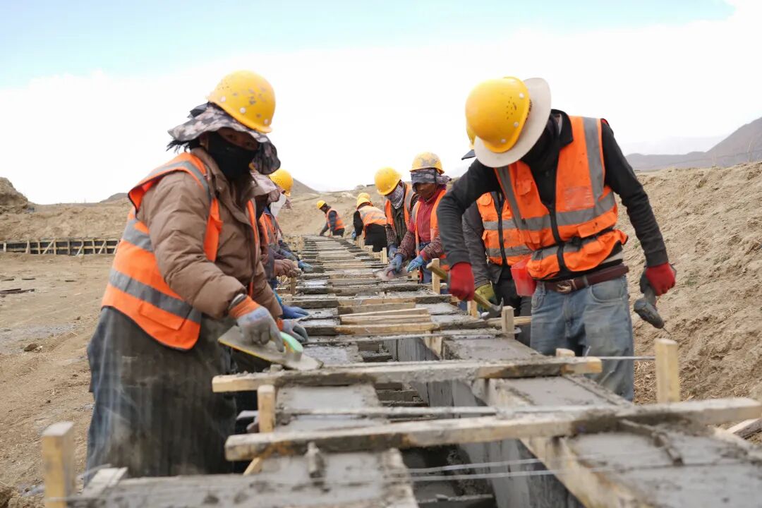 施工现场,青壮年搬运物料,妇女清理渠边杂物,年长群众在技术指导下操作小型机具,人人有事干、户户能增收。桑珠孜区农业农村局技术人员蹲点一线,手把手指导群众测量坡比、夯实基础、规范施工。