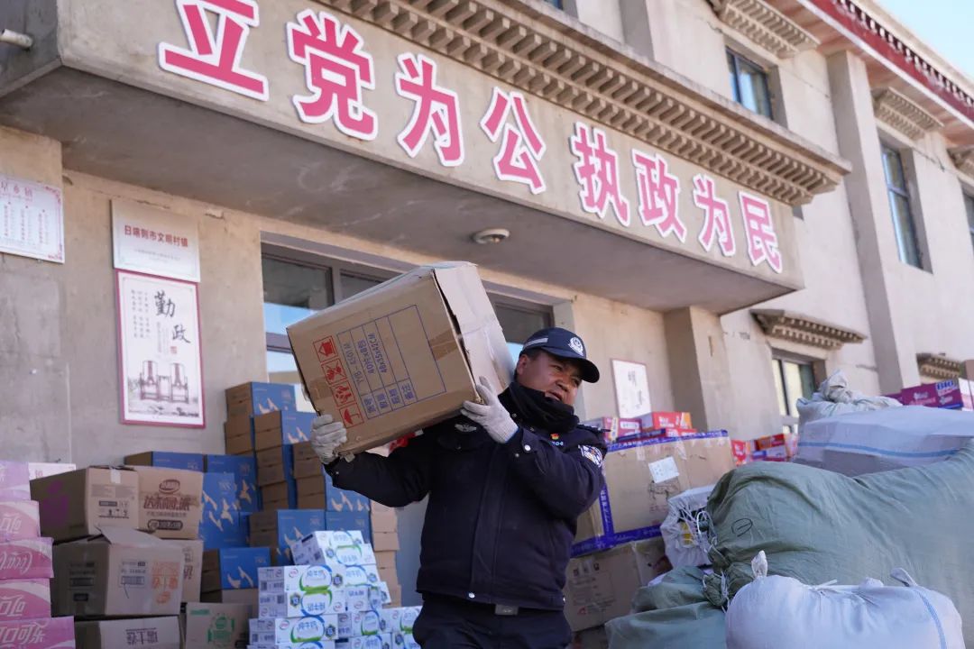 图为拉孜县芒普乡派出所辅警巴加搬运救援物资。