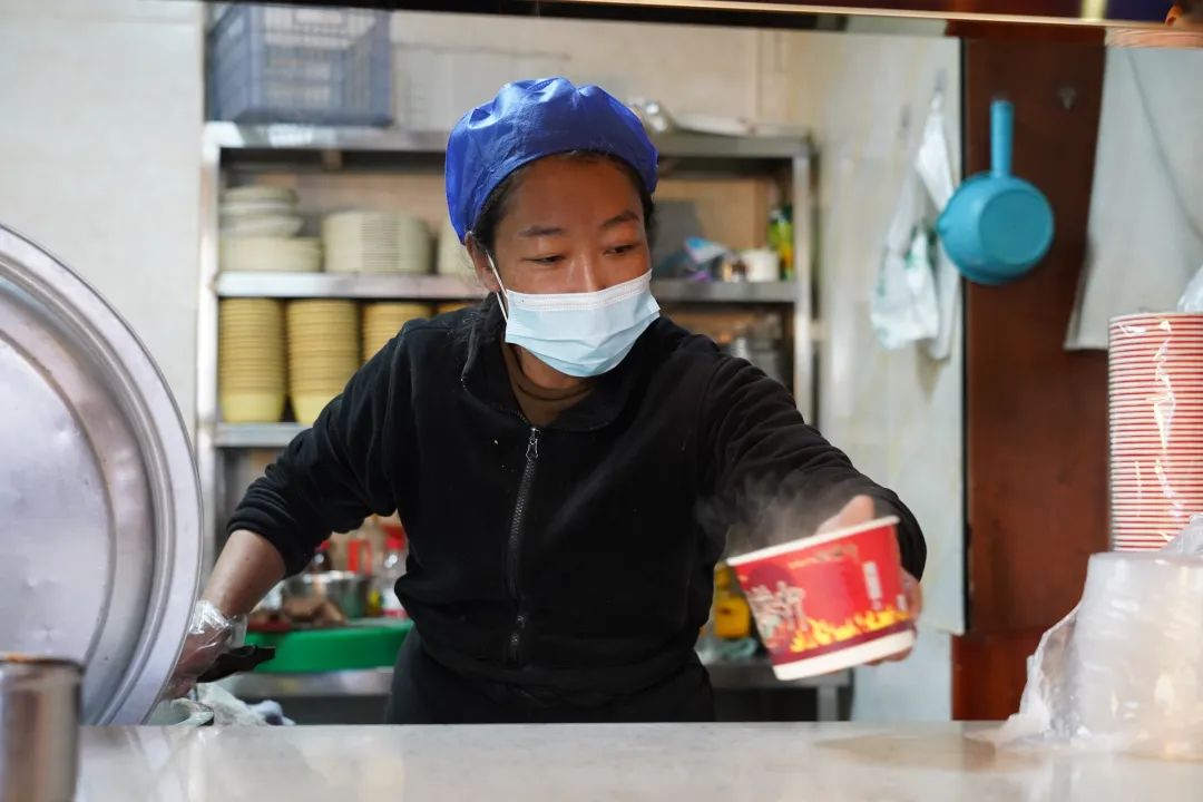 图为在拉孜县县城,拉曲闲谈茶馆为受灾群众和过往路人免费提供藏面、甜茶和肉饼。
