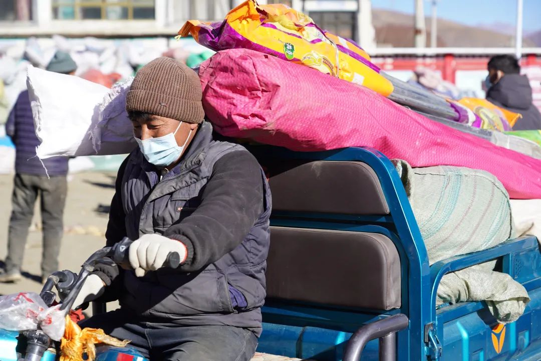 图为拉孜县芒普乡乃村村民搬运刚领取的救援物资。