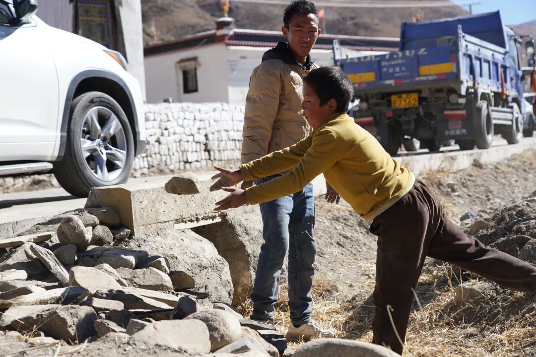 图为在拉孜县曲下乃萨村,村民铺设便道,为前往拉孜县芒普乡运输救援物资的车辆通行提供帮助。