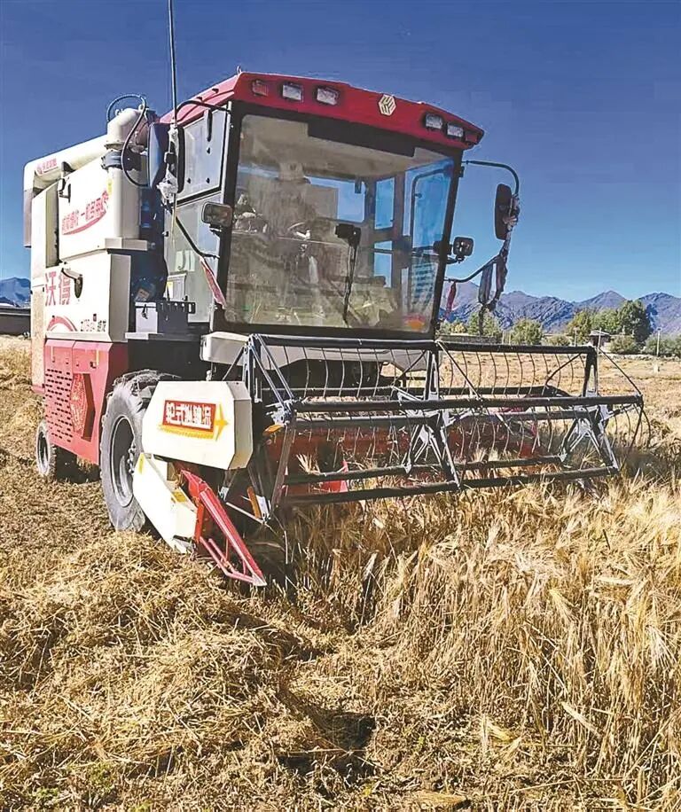 图为日喀则市桑珠孜区东嘎乡色定村农业发展专业合作社的联合收割机在为村民收割青稞。本报记者 马晓艳 摄