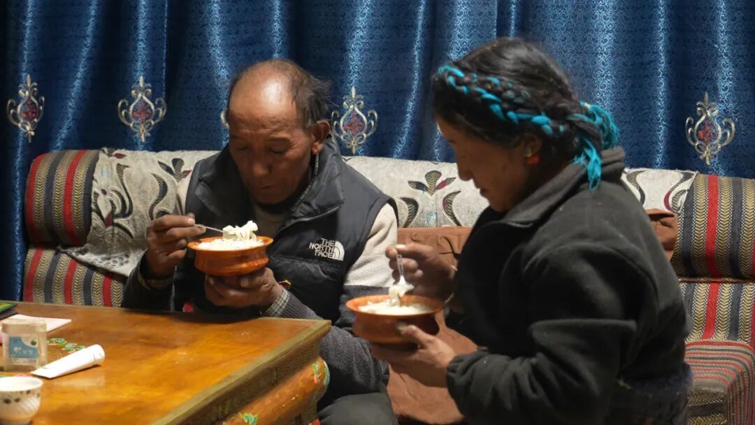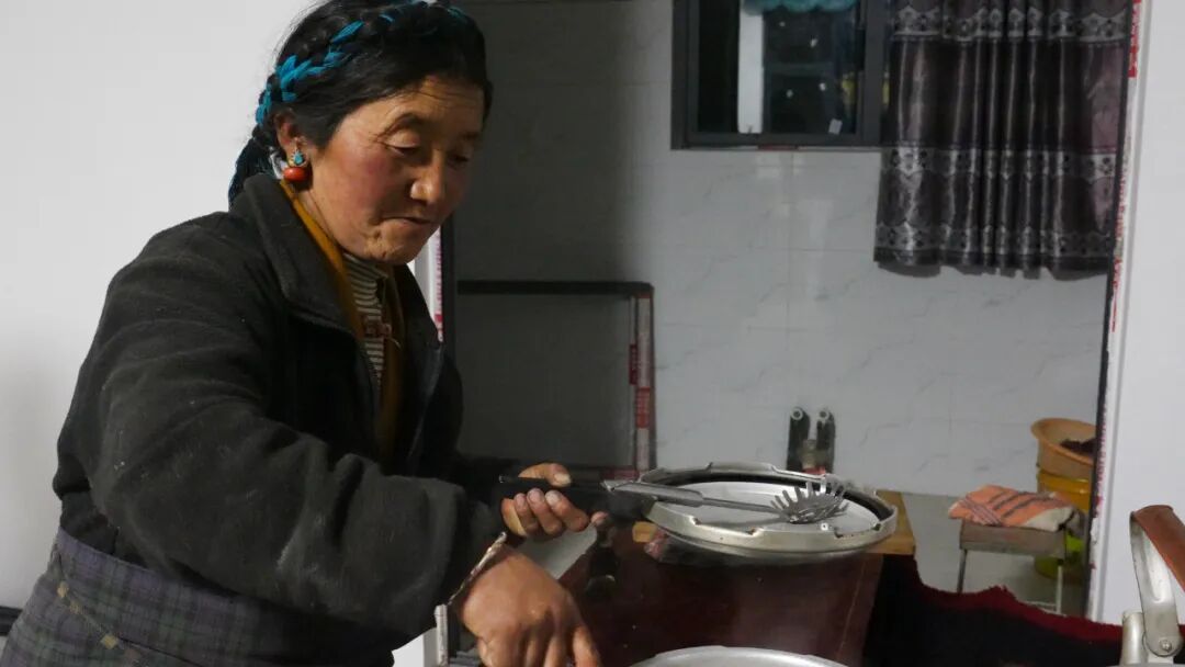 墙的那端,是村民边巴次仁的新居。炉膛里柴火 “噼啪” 作响,高压锅的蒸汽在双层中空玻璃上漫出雾花,刚煮好的牛肉面在火炉上咕嘟冒泡,葱香裹着热气扑满屋子。妻子边巴舀起一勺汤,两个孩子旦增吉热、普布卓玛追着玩捉迷藏,笑声绕着暖融融的空气打转。