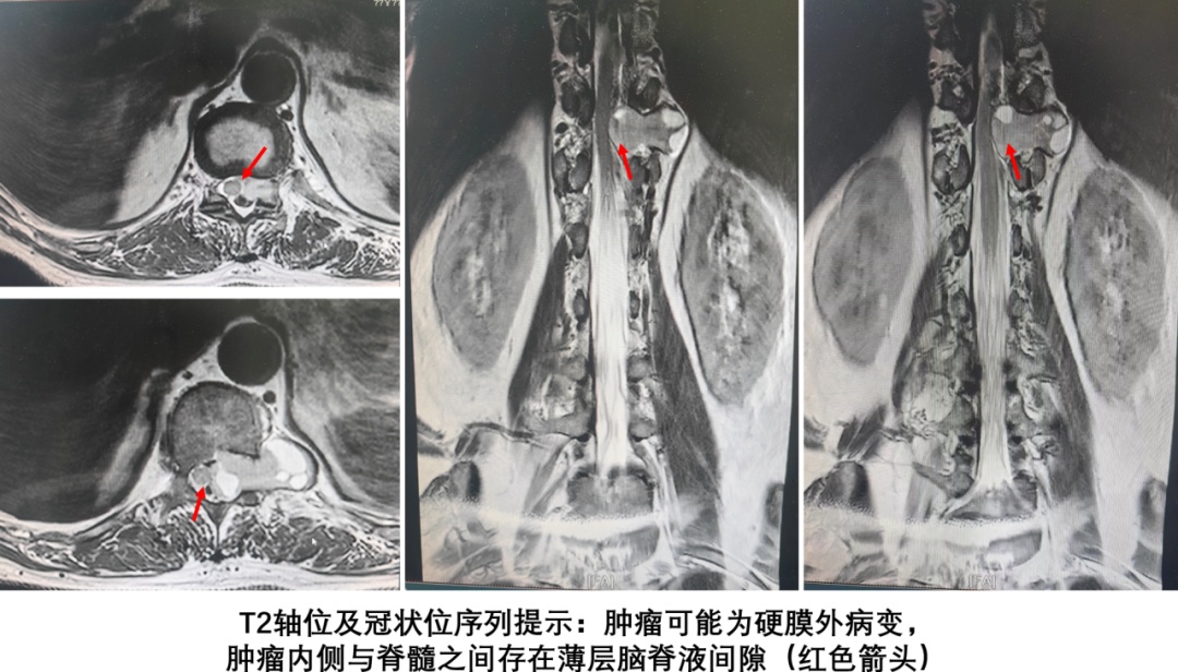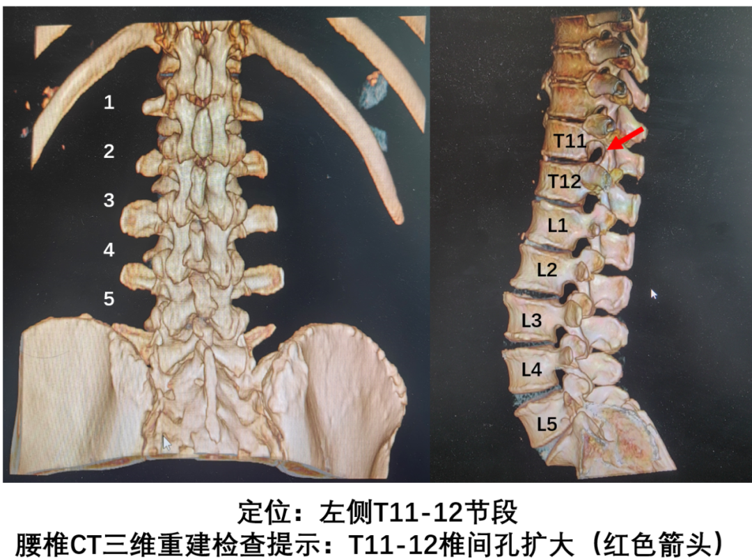 该患者自诉一个月前开始出现左侧季肋部背侧疼痛,疼痛程度较强烈,以夜间发作为主,严重影响睡眠质量,来医院门诊查上腹部CT提示:胸11-12节段椎管内外沟通性病变。之后行胸椎磁共振平扫+增强检查提示:胸11-12椎管内外沟通性囊实性肿瘤,呈哑铃型,考虑神经鞘瘤可能,伴临近胸11椎体受压吸收,胸11-12左侧椎间孔扩大,临近脊髓受压。