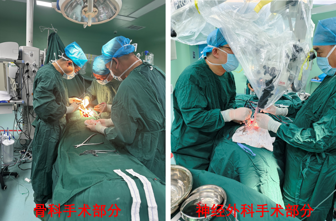 来自复旦大学附属中山医院神经外科的上海援藏专家刘腾飞主任对该患者进行详细的体格检查以及仔细阅片后,告诉患者:根据磁共振结果显示,该病变与患者症状有相关性,且肿瘤较大,手术是首选的治疗方案。手术虽然有一定风险,但如果选择保守治疗,将来随着肿瘤继续生长,椎管内肿瘤对脊髓的压迫将更加严重,有出现截瘫风险。但从磁共振上看,目前椎管内的肿瘤应该都还在硬膜外,与硬膜下病变相比,手术风险较小,而且这种手术在日喀则就可以做,不用去其他地方。患者及家属听到能在本地做,便立马同意入院做术前准备。日喀则市人民医院迅速组织本地神经外科团队与上海援藏医疗队的神经外科刘腾飞主任、骨科陈元元主任、放射科郭辰主任、胸外科冯键主任和普外科狄扬主任进行多学科联合会诊。团队针对患者的病情进行了细致严格的术前评估和术前讨论,围绕手术方案、手术入路、手术风险等进行重点讨论。最后,手术由多学科联合分步进行:由骨科援藏专家陈元元团队完成暴露及脊柱内固定、神经外科援藏专家刘腾飞主任团队完成肿瘤切除,术中如出现胸膜破裂,再由胸外科援藏专家冯键主任进行修补。这样既能保证肿瘤的精确切除、减少脊髓神经的损伤,又能保证患者术后脊柱稳定性,减少术后脊柱、肺部相关并发症,充分发挥各科室所长,可谓强强联合,精准除瘤。