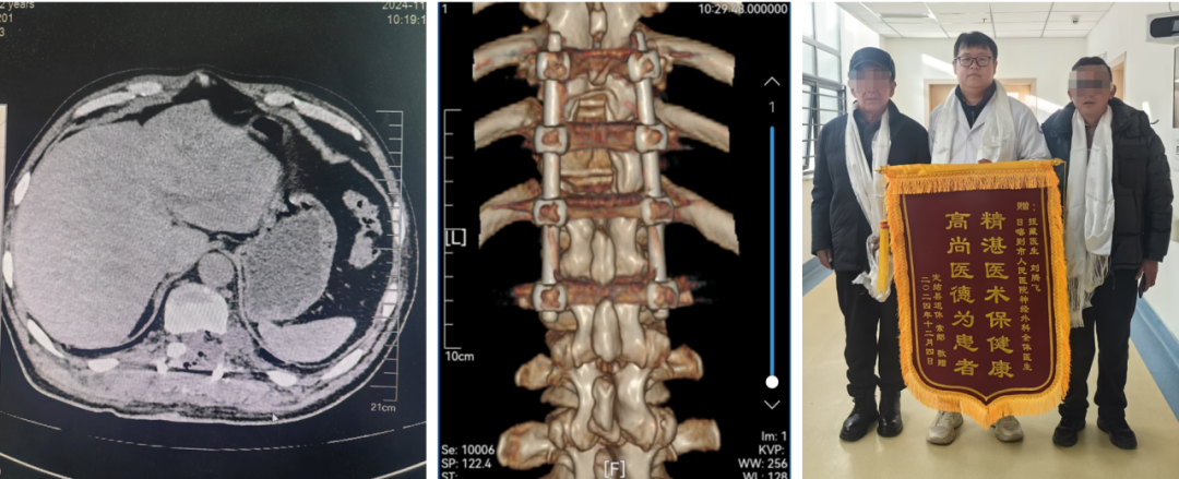 术后患者恢复非常好,术前症状完全消失,并无新发神经功能障碍。立竿见影的手术疗效,让患者及家属惊喜不已。术后复查胸椎X片及CT三维重建显示:内固定良好,肿瘤无残留。患者及家属对手术效果非常满意,对医院多学科诊疗团队的精湛技术和护理关怀感激不尽,出院时特地赠送锦旗表达感谢之情。
