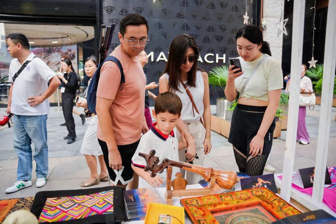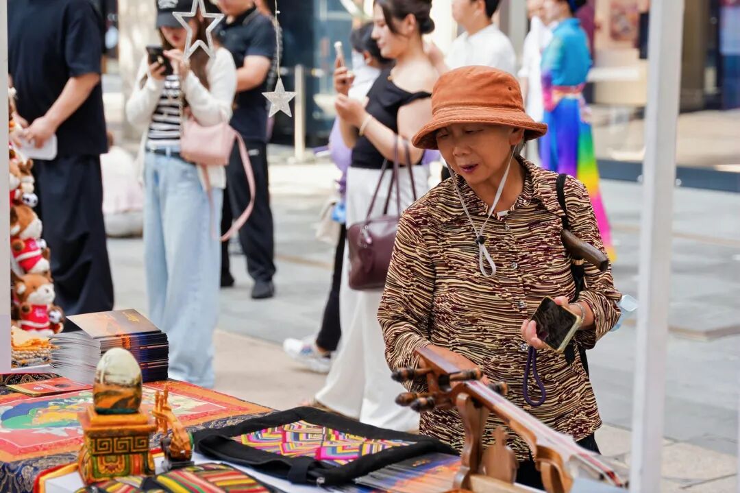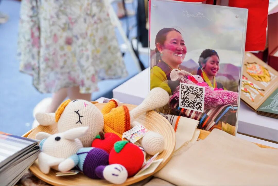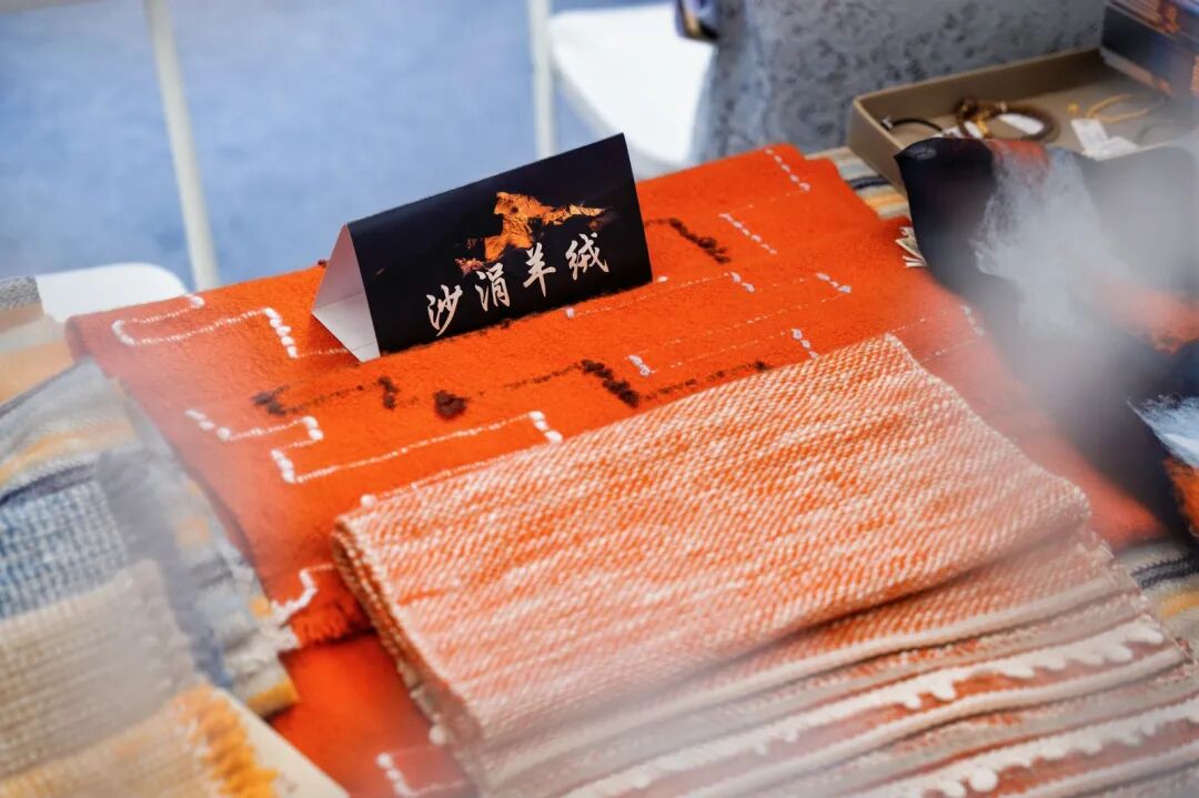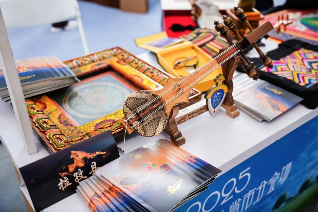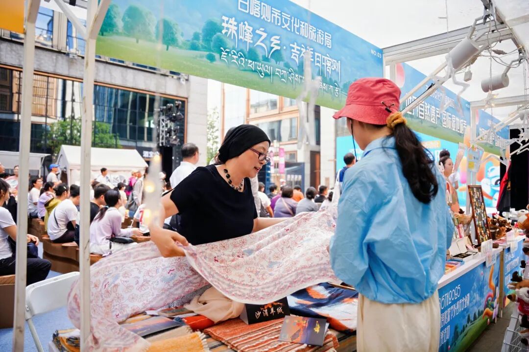 与此同时,日喀则展区也格外热闹,扎念琴、唐卡与沙涓羊绒制品等特色产品集中亮相,直观展现传统技艺与现代产业的融合成果。作为“非遗产业化”的典范,当地的羊绒产品“沙涓”声名远播。在上海援藏项目扶持下,当地依托日喀则雪域珍稀山羊绒资源,传承两千年非遗氆氇手工艺的同时将藏式传统纹样融入现代设计。产品远销巴黎、纽约,还曾登上联合国第一夫人午宴T台。展区另一侧,扎念琴琴身雕刻藏式传统花纹、音色悠扬,唐卡以天然矿物颜料绘制、色彩浓郁持久。工作人员现场讲解非遗传承故事,让上海观众直观感受雪域文化的匠心与温度。