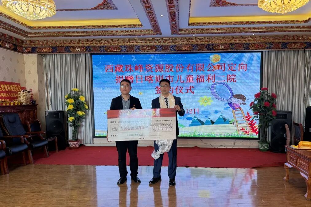 在上海市第十一批援藏干部及日喀则市相关部门负责人见证下,西藏珠峰资源股份有限公司与日喀则市慈善总会举行定向捐赠仪式,向市儿童福利二院捐赠338万元,专项用于建设中华民族共同体实践点项目,进一步推动当地儿童福利事业发展。