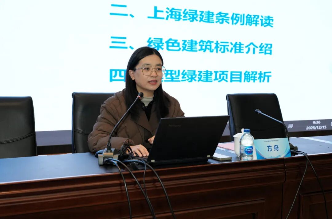 首场专题交流环节,由上海建科院低碳院副院长方舟主讲“绿色建筑政策标准与实践探索”。课程围绕国家与地方绿色建筑标准体系展开深入探讨,重点分享了节能材料应用、可再生能源技术等领域的创新实践,并结合上海本地标杆项目进行案例解析,为两地住建工作者提供了宝贵的经验参考。