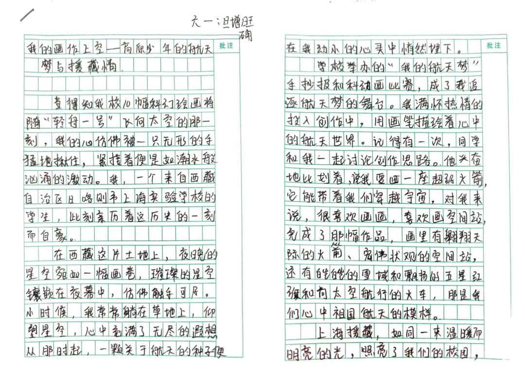 日喀则市上海实验学校在上学期举办了主题丰富的科技节活动,该活动得到了中国科学院微小卫星创新研究院的大力支持与协助。活动期间,在援藏教师的专业指导下,同学们积极参与航天主题科幻绘画创作,涌现出许多优秀作品。经过多轮严格筛选,最终有10幅优秀科幻绘画作品脱颖而出,获得了跟随火箭一同升空、奔赴浩瀚宇宙的宝贵机会。来自日喀则市上海实验学校六年级1班的旦增旺确,便是参与此次科幻绘画创作的同学之一,他将这份激动与自豪,悄悄写进了自己的日记本里: