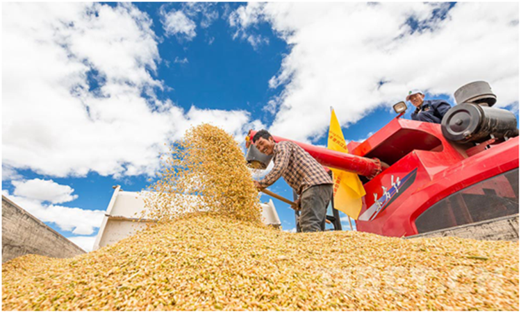 图为日喀则市江孜县紫金乡努堆村机械化秋收现场 摄影:赵耀