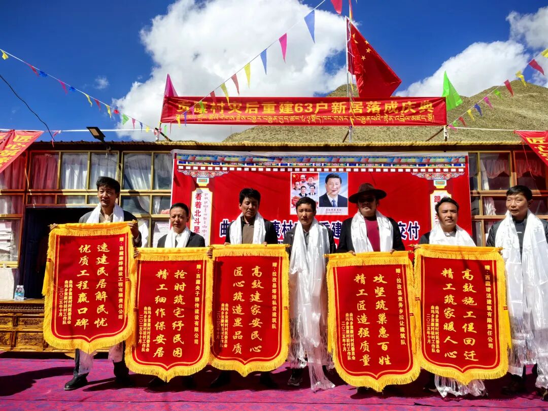 随后,施工方与贡康村村委会互送锦旗。锦旗上熠熠生辉的金色字迹,映照出各方在工期规划、建筑细节、建材运输等方面共同奔波的身影,是重建路上同心协力的见证,更是民族团结交流的生动写照。