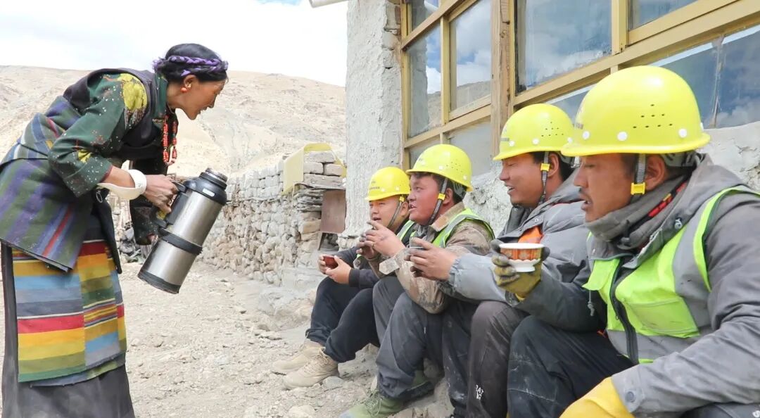 院落一角,阿佳拉巴仓觉轻轻搅动着壶中的酥油茶,袅袅茶香在高原清澈的空气里静静流淌。她双手捧着刚刚煮好的热茶,将这份滚烫的心意递到工人们手中。这碗乳白色的醇香,不仅盛满了阿佳对建设者们的由衷感激,更承载着高原阳光里最质朴的温暖。